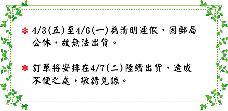 ※4/3(五)至4/6(一)為清明連假,因郵局公休,故無法出貨。